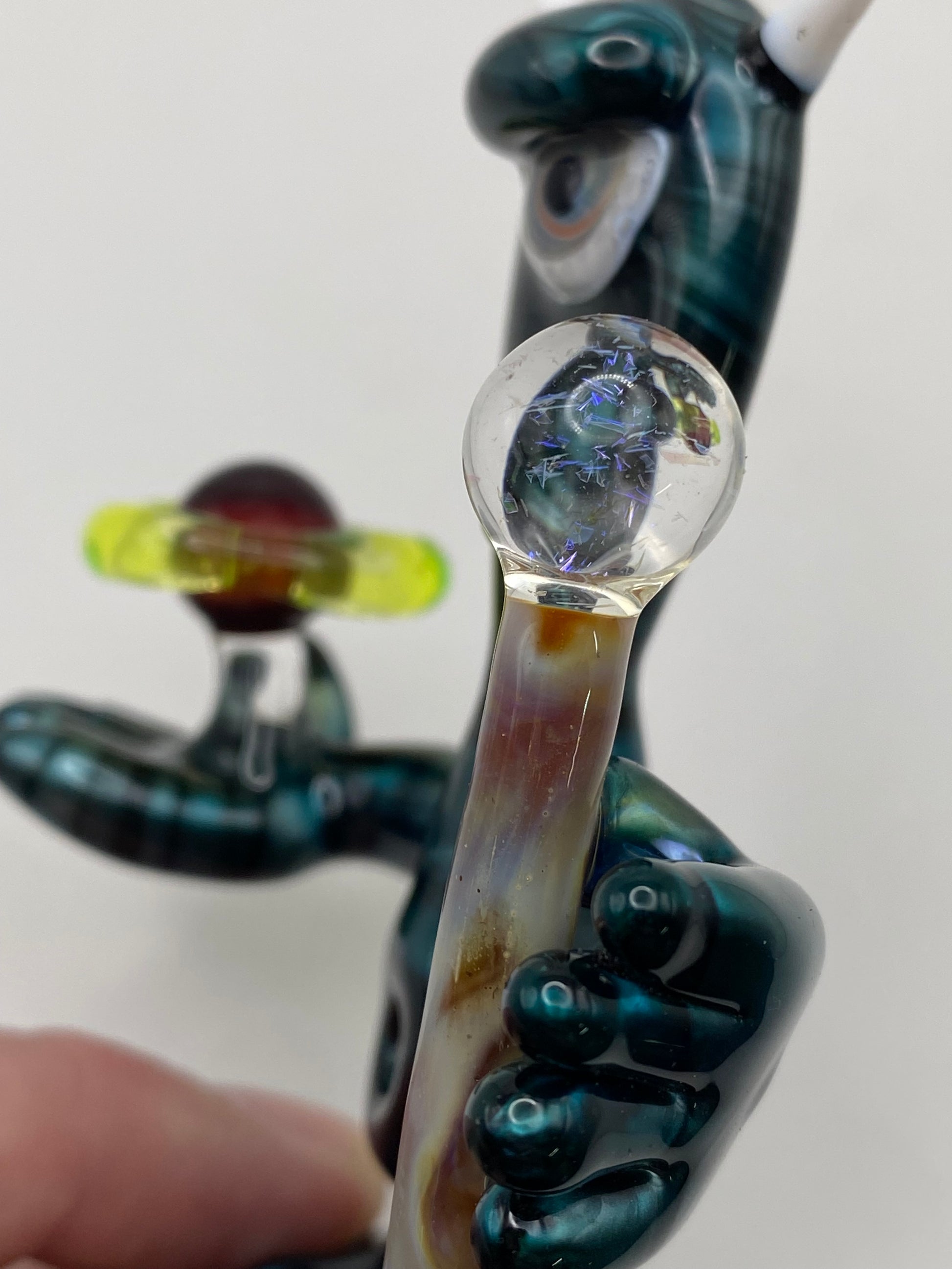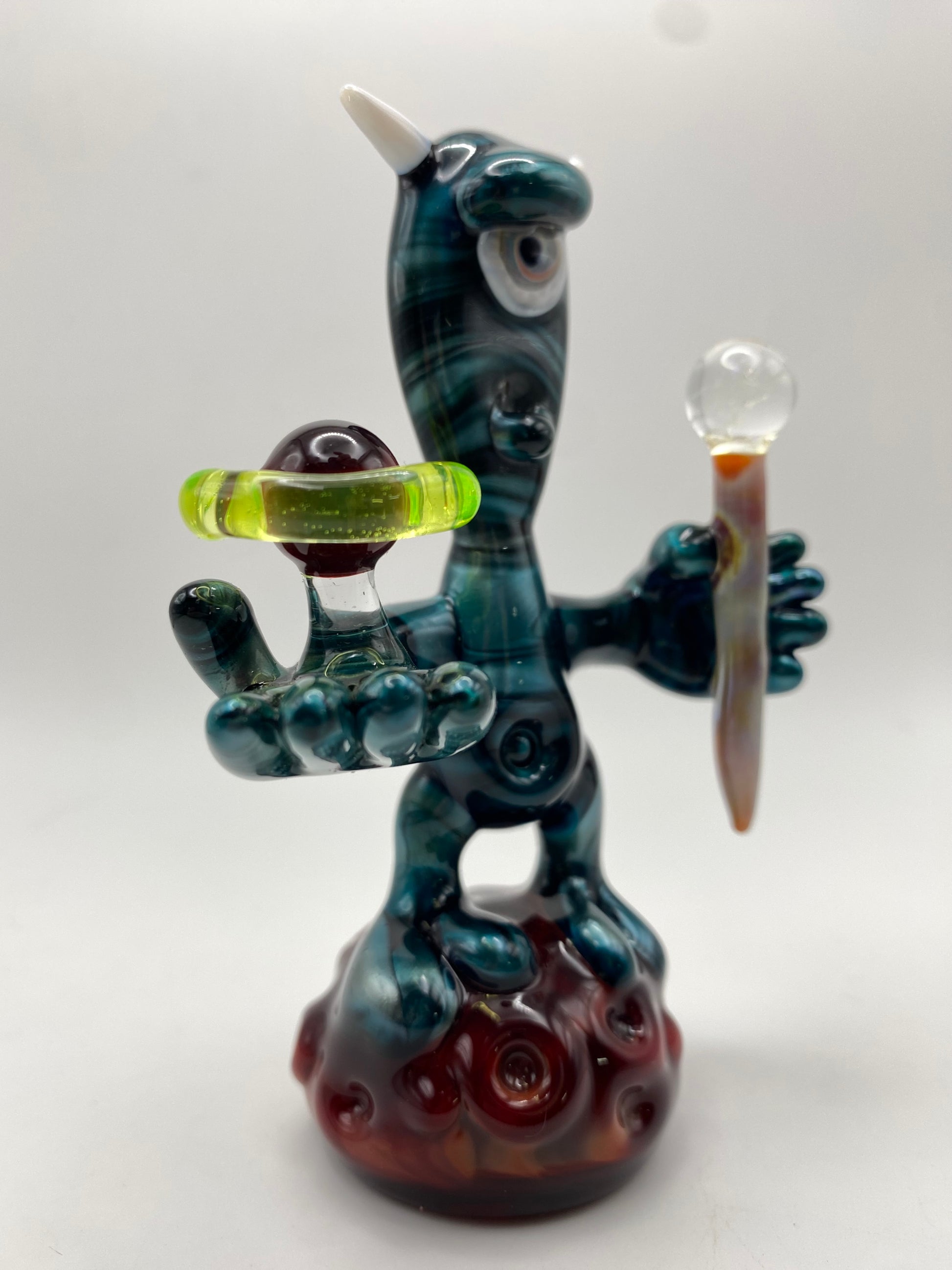 This glass sculpture showcases an alien shaman. He is holding his home planet and a dichroic staff to ward off the bad spirits.