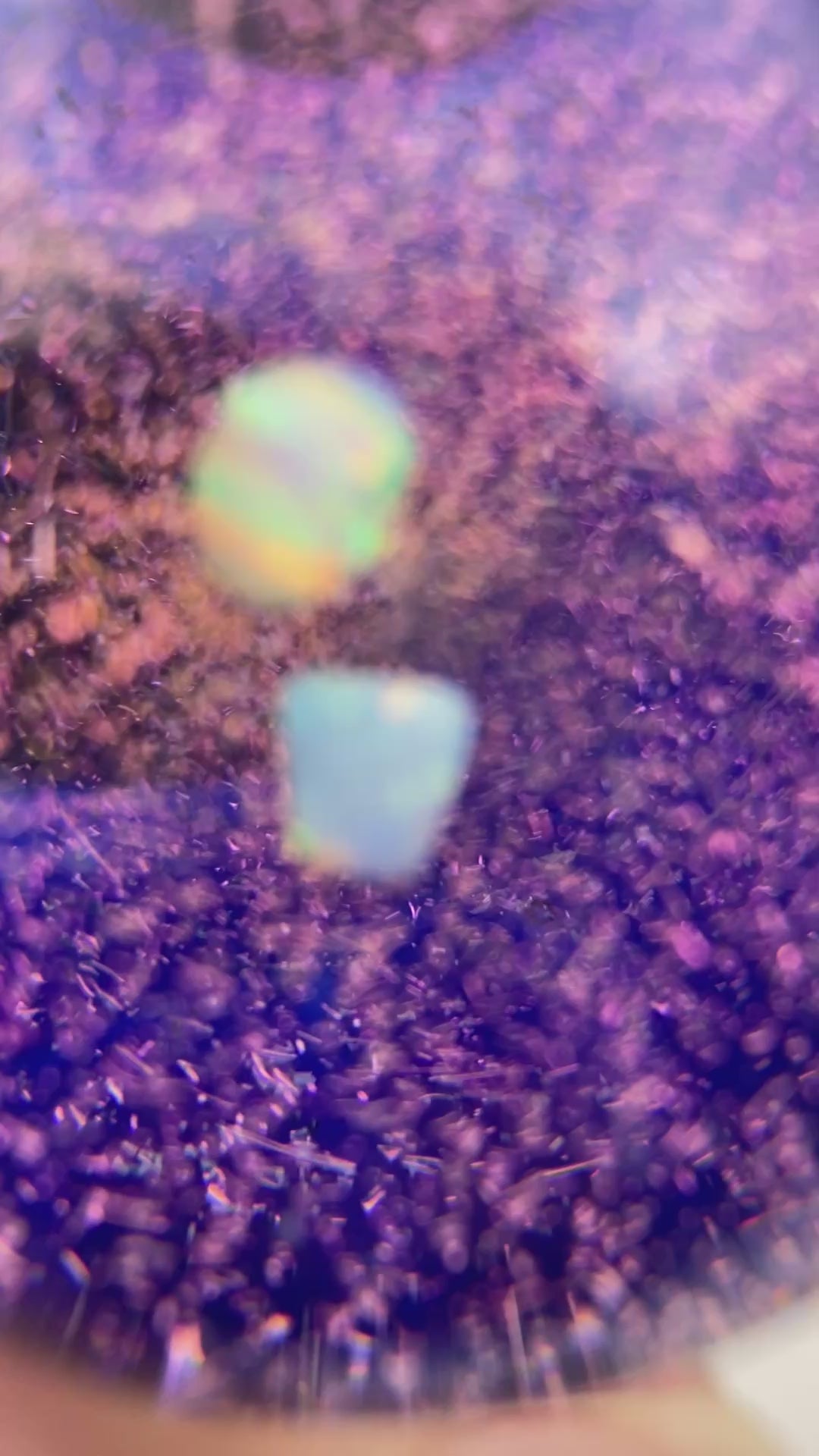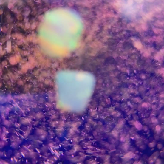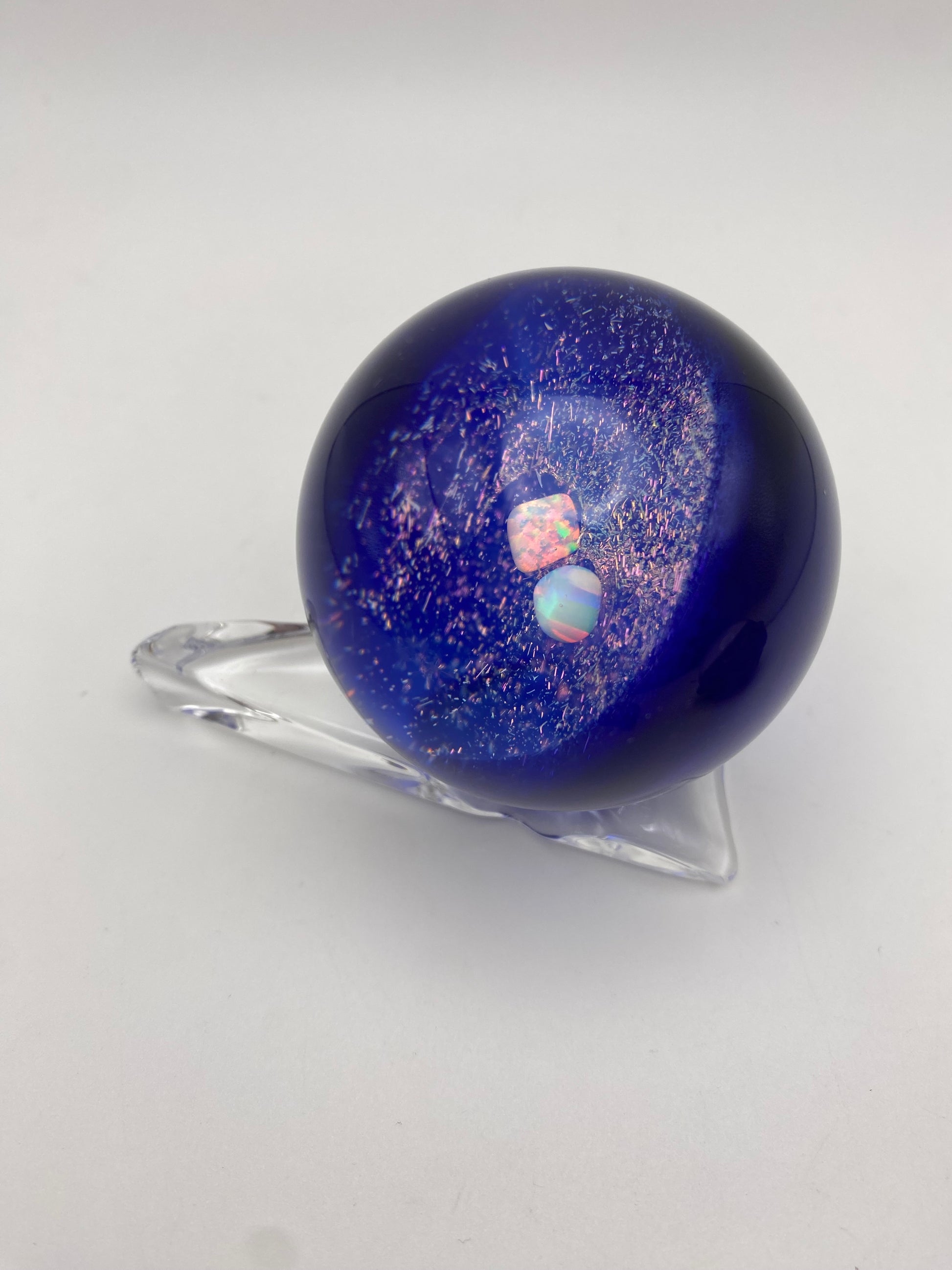 This Galaxy marble features two floating Opals with a cobalt background. It measures approximately 2 inches wide.