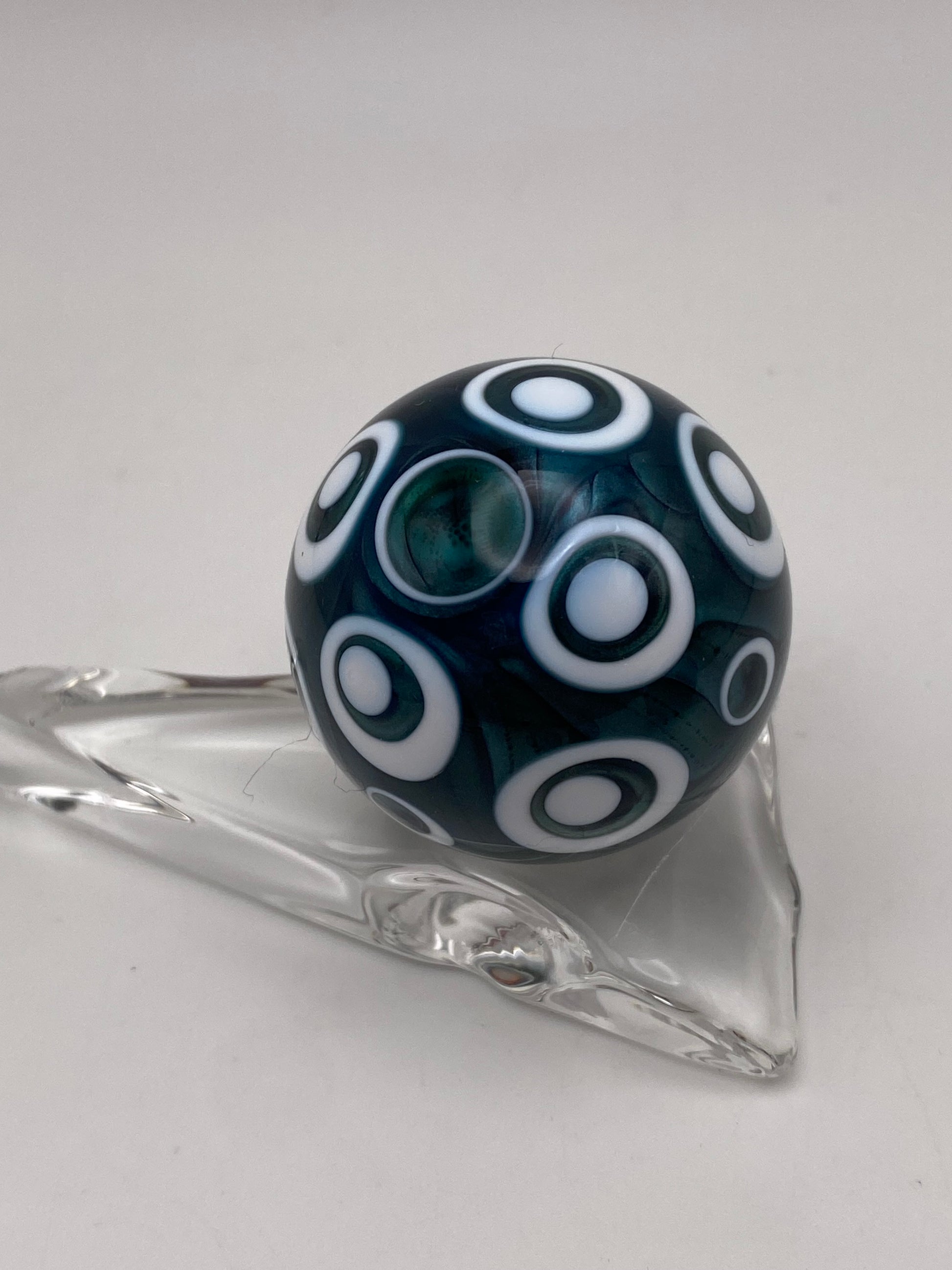 This Galaxy marble features a galaxy and a Volkswagen bus murrine. It is backed with neptunium and lotus white and measures approximately 1.25 inches wide. Comes with stand.