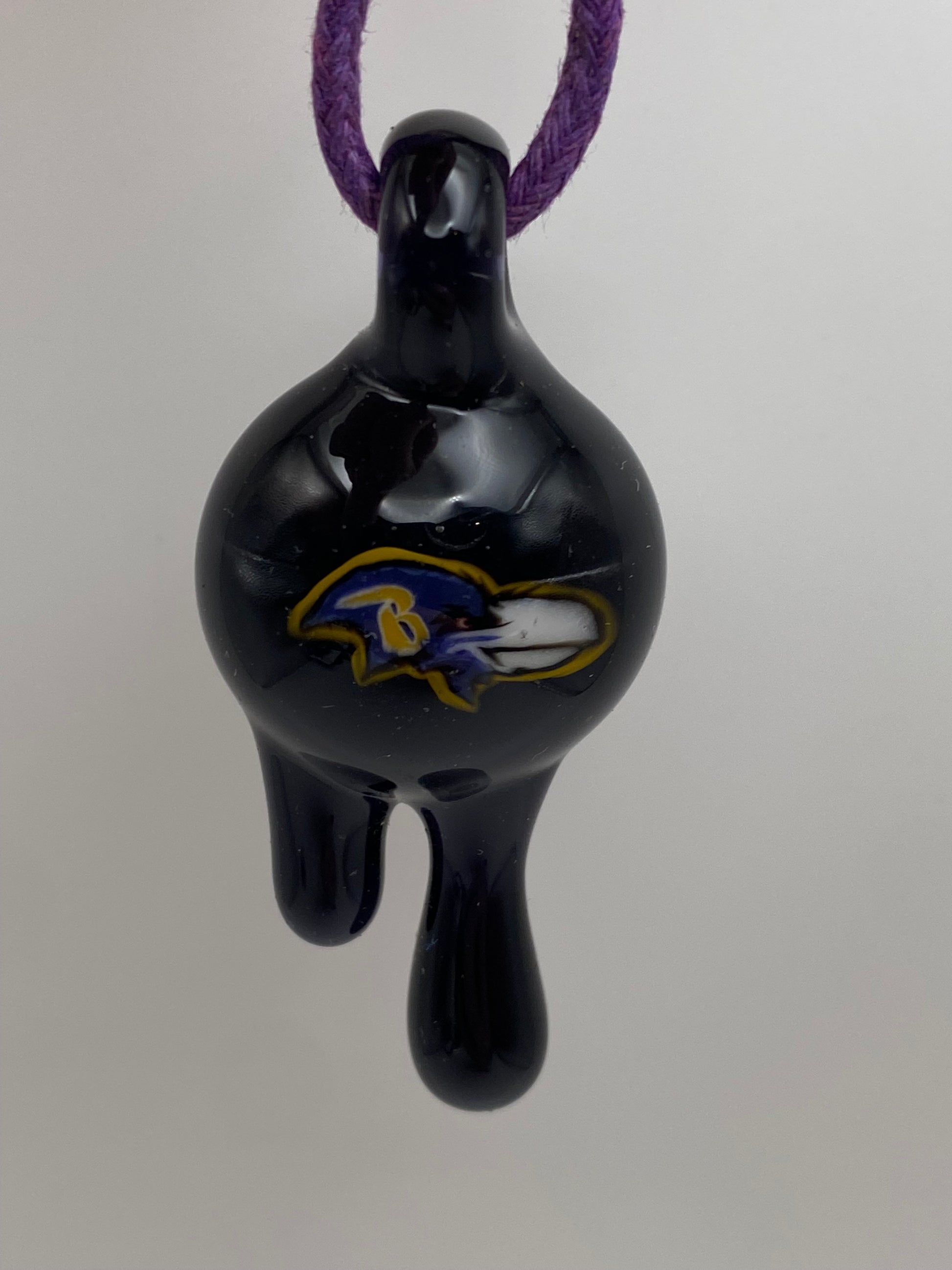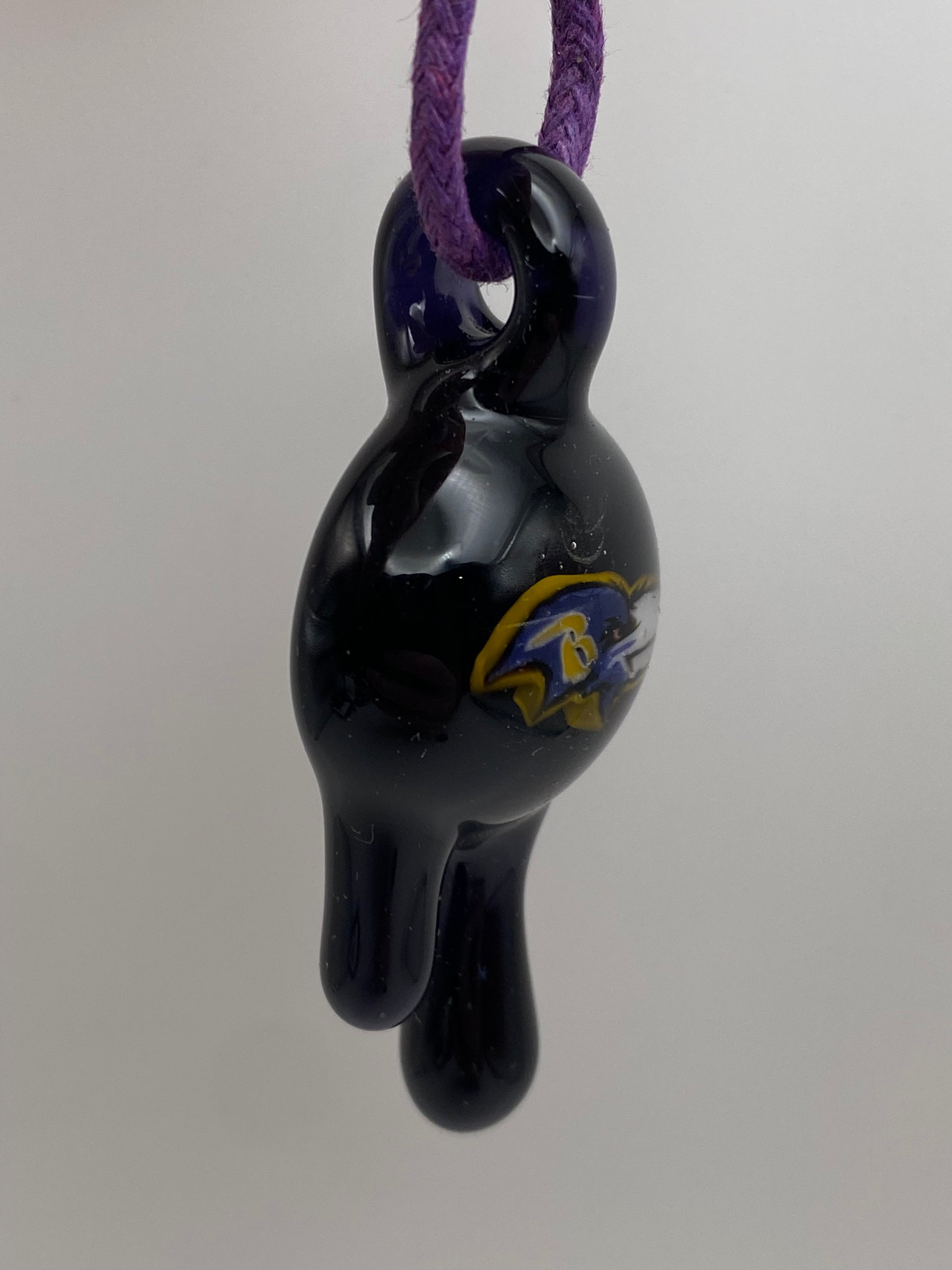 This pendant features a Baltimore Raven and has a dark purple backing and drips.
