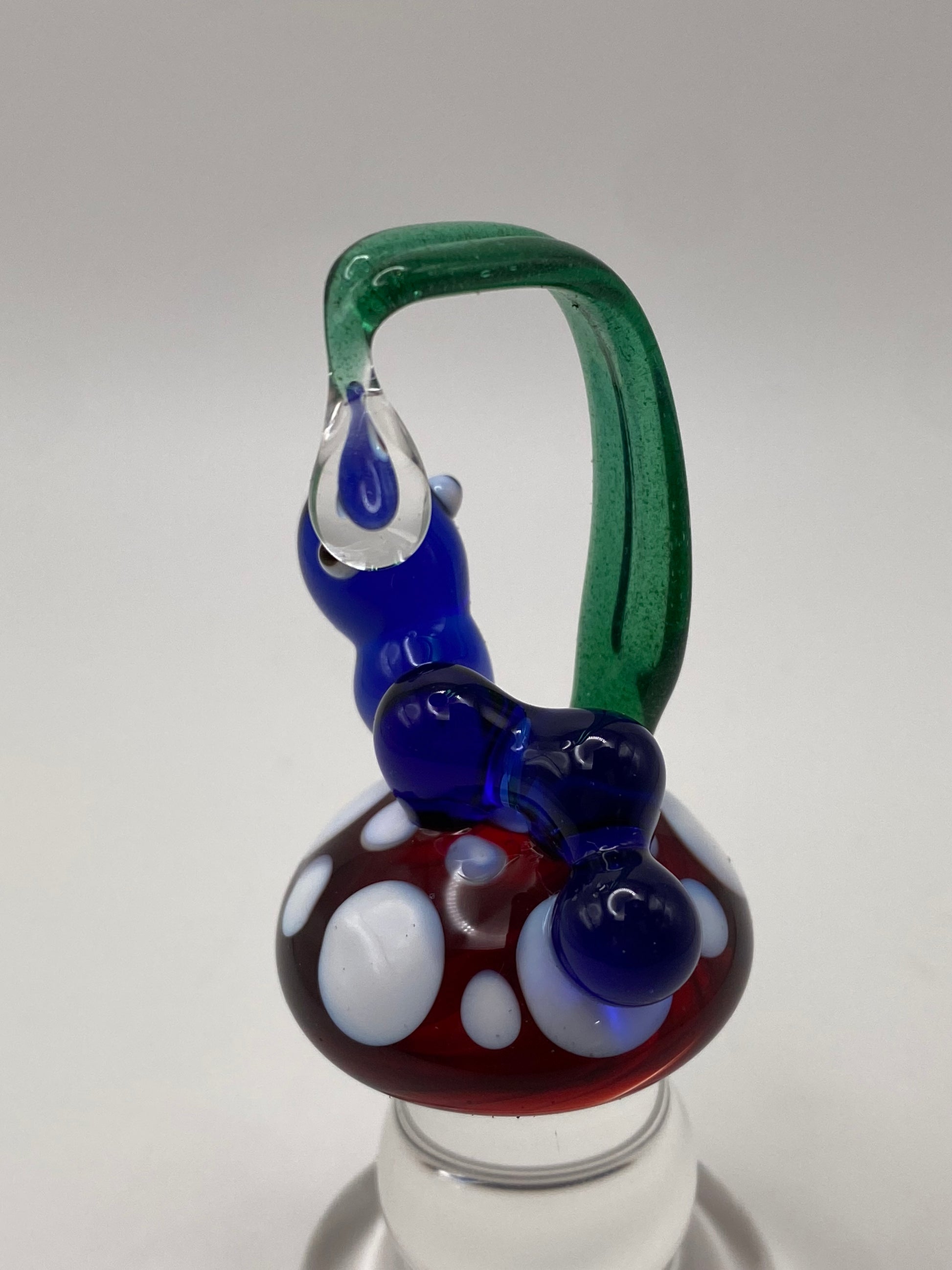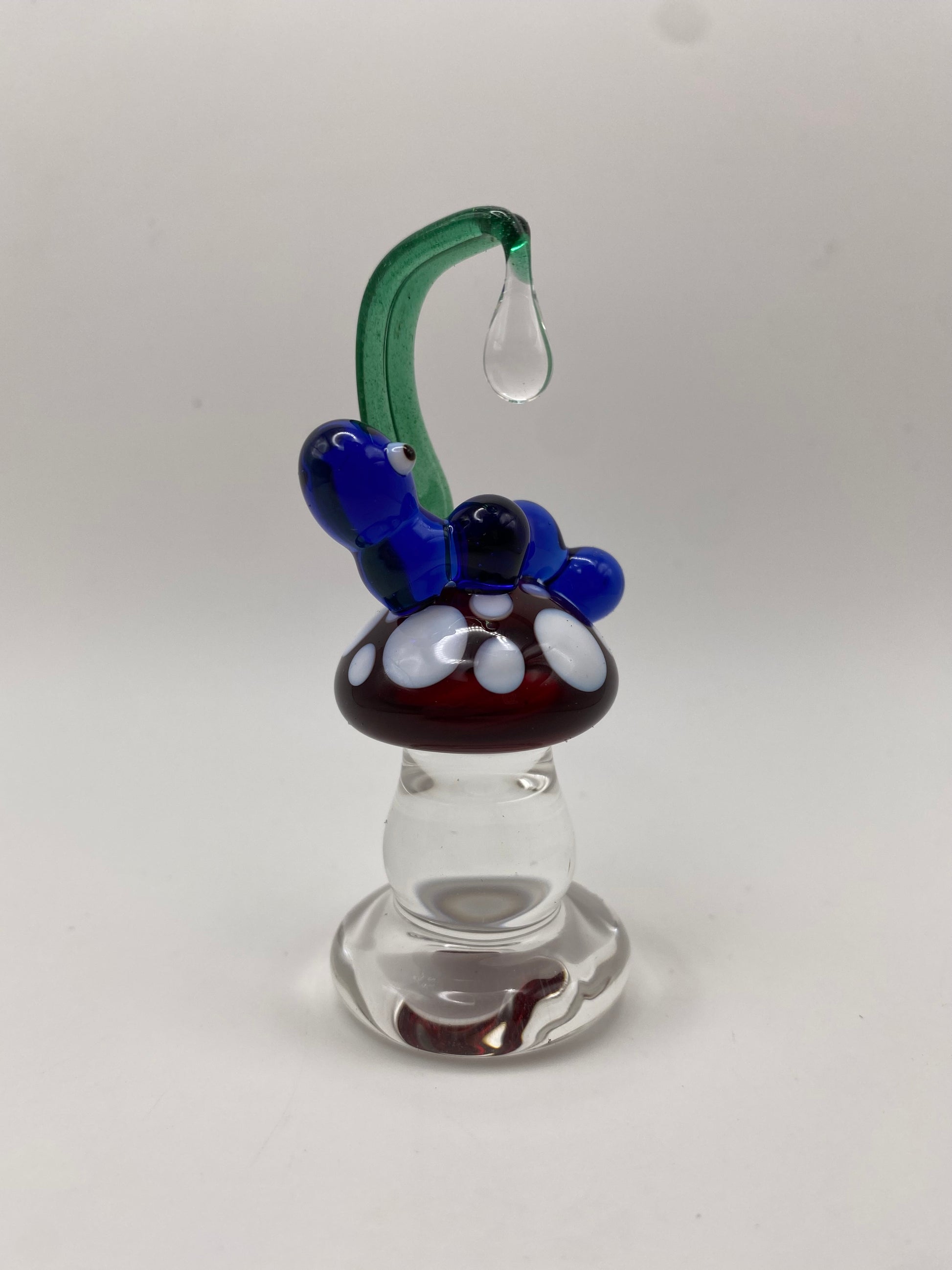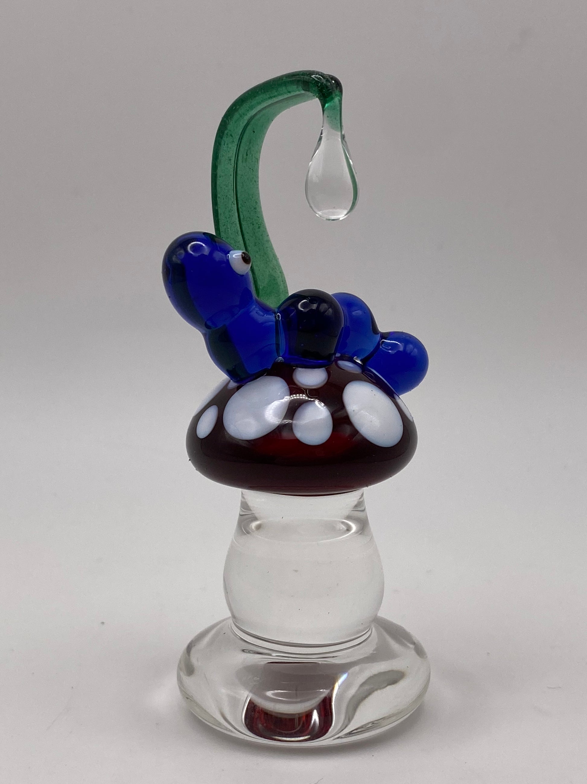 This blue caterpillar is perched upon a red mushroom with white dots. Its early and the dewdrops are falling. It measures approximately 3.5 inches tall.